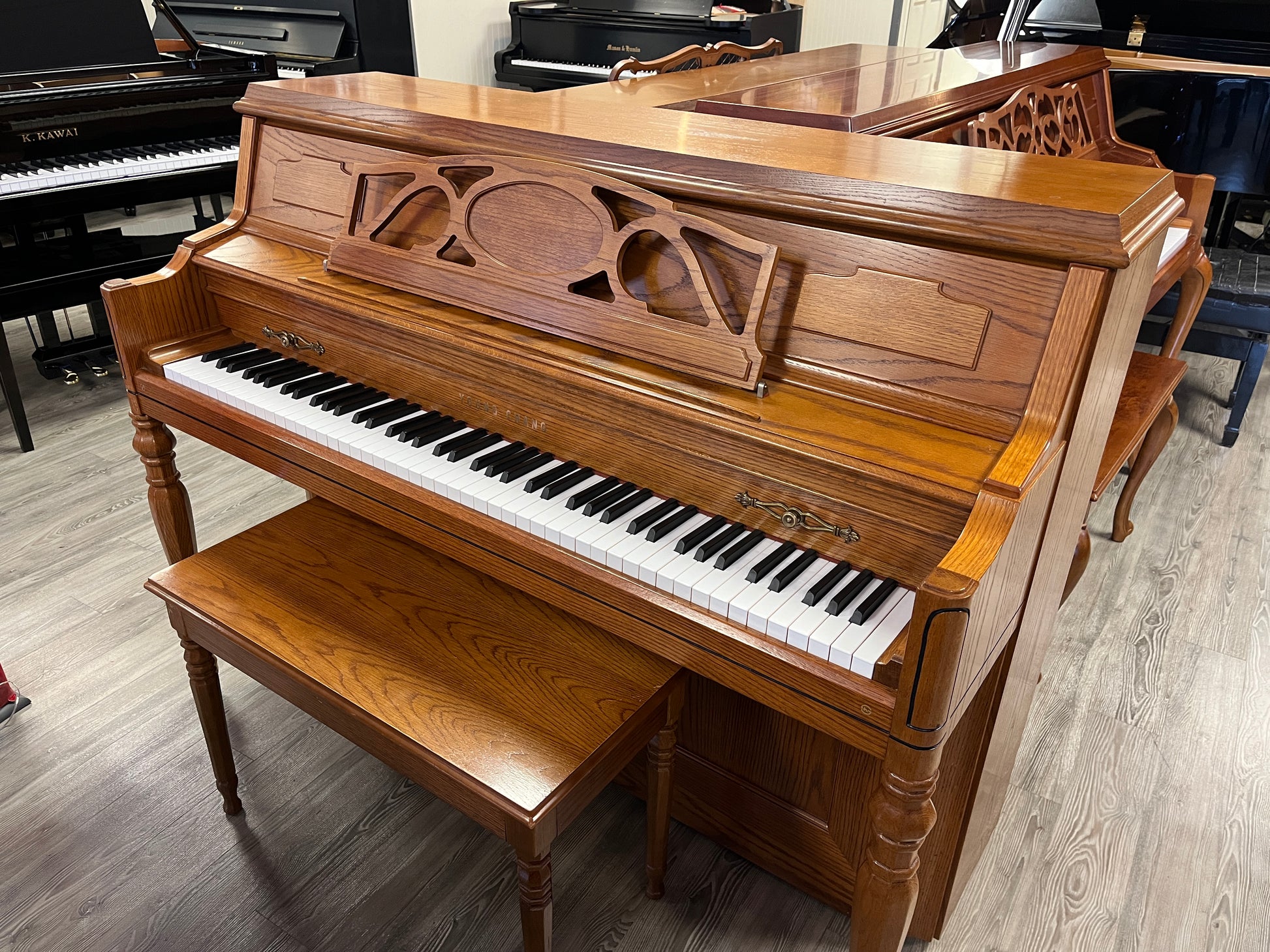 All of our pianos include: Matching bench with storage, delivery within 60 miles, free tuning within 6 months, and full 10-year transferable warranty.
